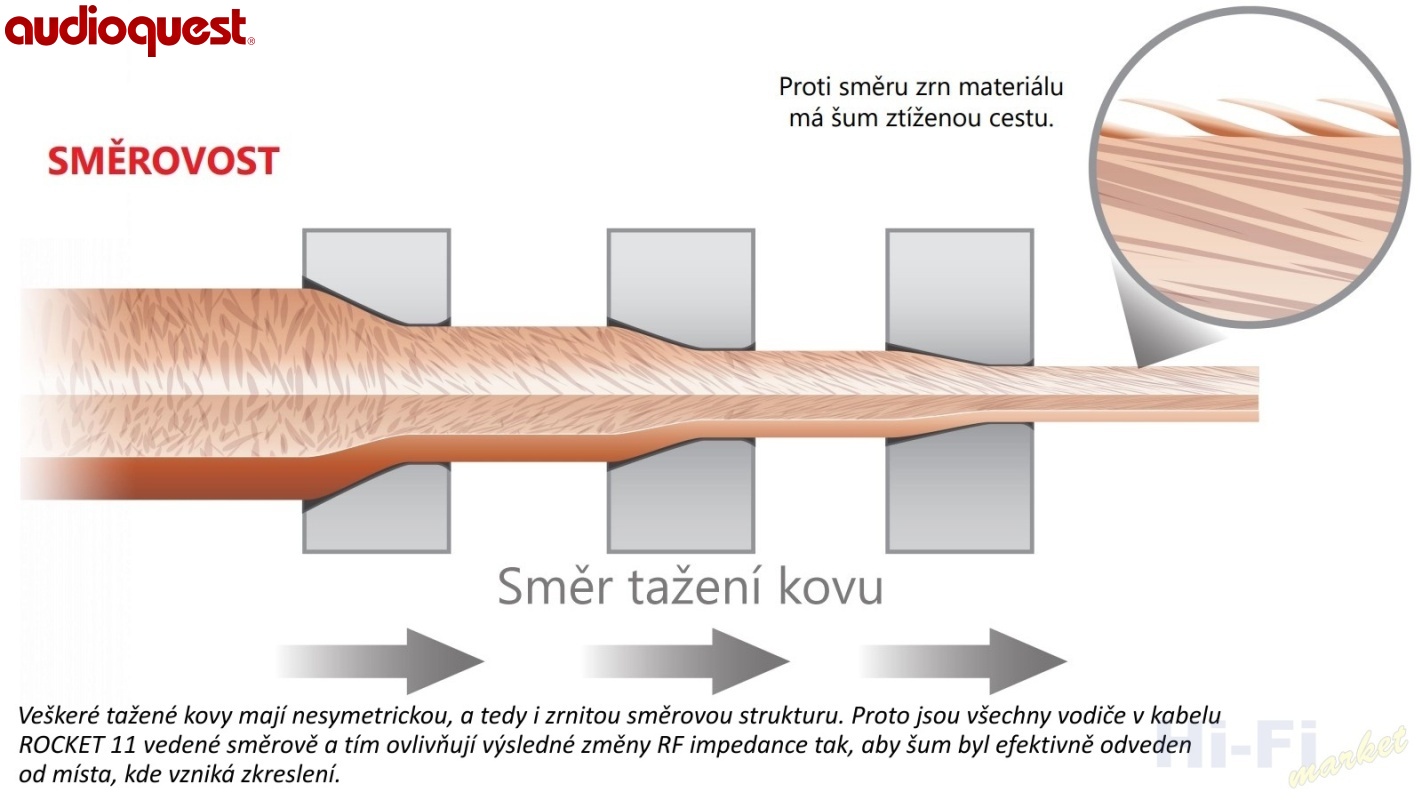 Materiál vodičů se vždy promítá zásadním způsobem do výsledné zvukové kvality. Kabel ROCKET 11 sází na léty prověřenou kvalitu a technologii společnosti AudioQuest a využívá směrově vedené vodiče vyrobené z vysoce čisté výběrové mědi LGC s dlouhými zrny. Měď LGC (Long-Grain-Copper) s dlouhým zrnem má na povrchu vodiče méně oxidů, méně nečistot a méně přechodů mezi jednotlivými zrny materiálu, což ve výsledku znamená menší zkreslení a významně lepší výkon než přináší standardní měď OFHC.