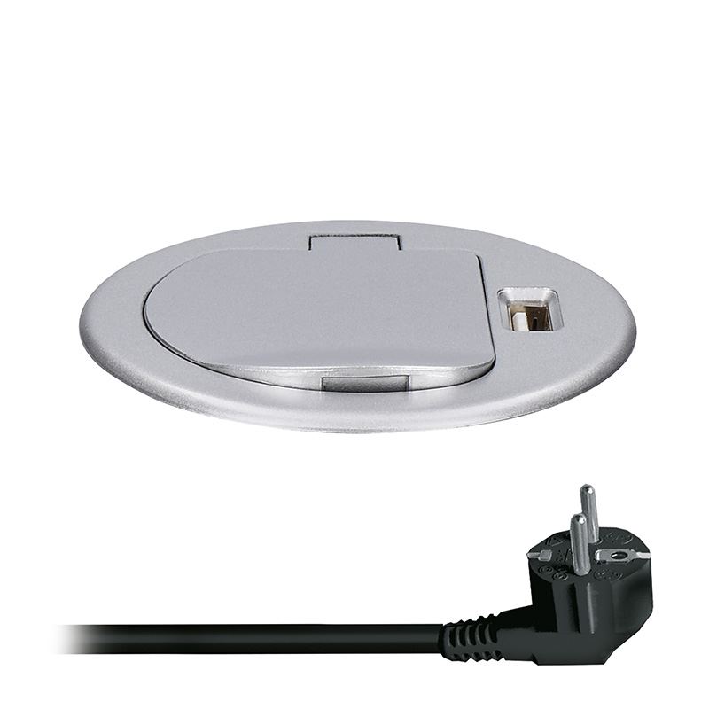 Úvod » Kabely » Napájení - prodlužovačky » Solight USB vestavná zásuvka s víčkem, 1 zásuvka, plast, délka 1,5m, 3x 1mm2, USB 2100mA, stříbrná