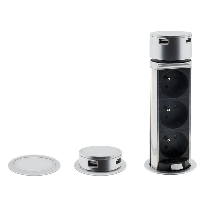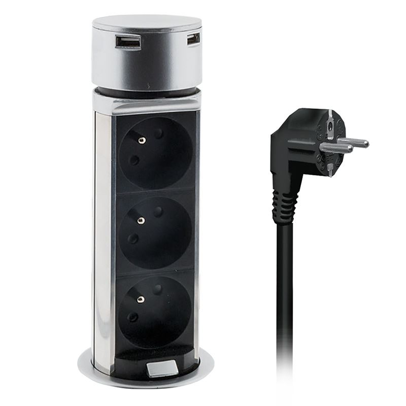Úvod » Kabely » Napájení - prodlužovačky » Solight USB výsuvný blok zásuvek, 3 zásuvky, plast, délka 1,5m, 3 x 1mm2, stříbrný