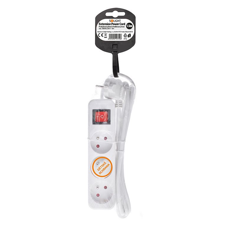 Úvod » Kabely » Napájení - prodlužovačky » Solight prodlužovací přívod, 3 zásuvky, bílý, vypínač, 1,5m