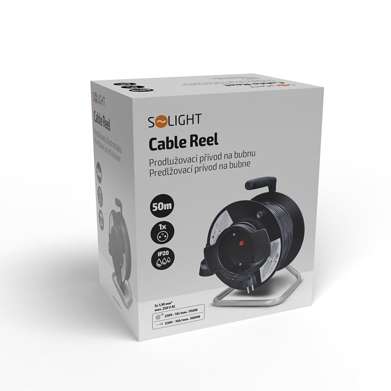 Úvod » Kabely » Napájení - prodlužovačky » Solight prodlužovací přívod na bubnu, 1 zásuvka, 50m, černý kabel, 3x 1,5mm2